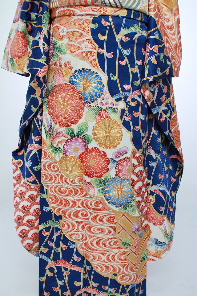 特徴:紺を基調とし、四季の植物が沢山描かれています。どの季節でも華やかに着ていただける1着です。