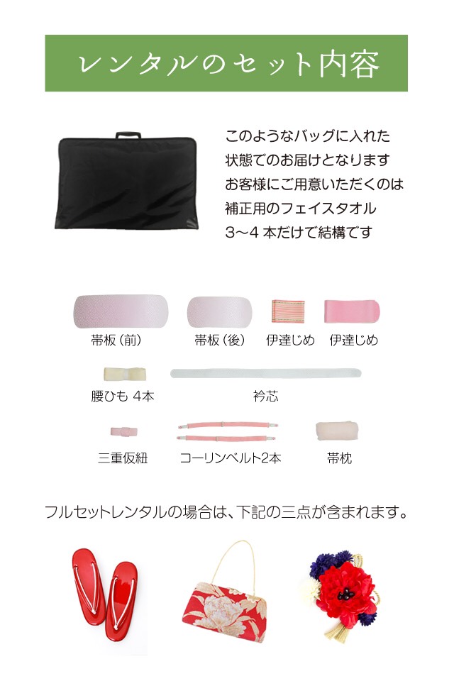 また、「着物のみ」でご注文をされた場合は、草履・バッグ・髪飾りはセットに含まれません。