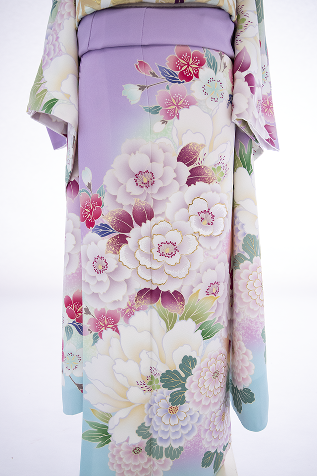 特徴:薄紫色を基調とし、白の牡丹が華やかな着物です。大人っぽさのなかにやわらかでかわいらしさのある雰囲気をもっています。ほんわか品のあるコーディネートです。